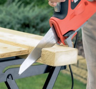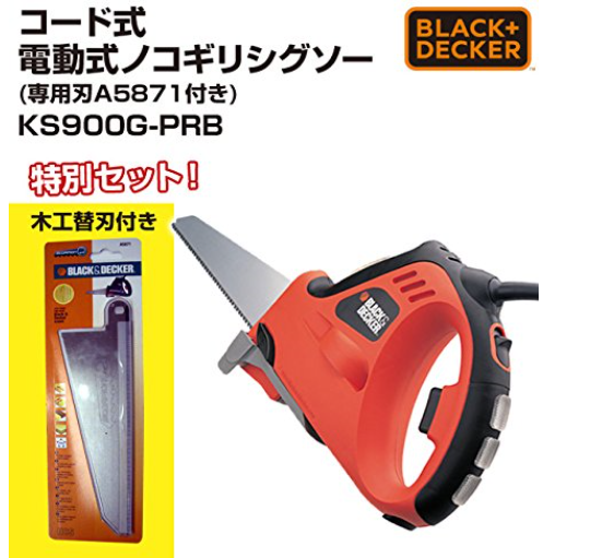 2019/01/06 Category : 電動式ノコギリ ベスト商品 家財の処分が必要になり、粗大ゴミを減らすために購入しました ブラックアンドデッカー(BLACK+DECKER) コード式 電動式ノコギリ・シグソー 木工替刃付き 【特別セットモデル】 KS900G-PRB ☆家財の処分が必要になり、粗大ゴミを減らすために購入しました。木製のものから金属製のものまで元はとれるだけの切断をしましたが、本体がある程度重いものの、女性でも扱える品物でした。手首から肘ほどの太さの木の伐採も上手くいきました。 最初、刃の取り付けが硬くてなかなか上手くいきませんでしたが、1回取り付けたあとは慣れなのか、刃の交換もスムーズにできます。 ☆古い家具などの粗大ゴミ類を可燃ごみにして処理するのと、家具を自作するのに買いました。作業効率格段にアップ。使いごごちもよく、コードも長いので、取り回しよく、出力や安全性、振動や反動も女性でも問題なく、コスパもよく、大きさもちょうどよく、快適な使い心地です。 商品説明 電気ノコギリとジグソー、1台2役のコード式マルチタイプと木工替刃のセット。枝切りや金属の切断などに適した「電動ノコギリ」から、曲面加工なども容易な「ジグソーモード」にワンタッチで刃を換えることが可能。誤作動防止機能付き。 6m延長コード、木工切断用ブレード(Z5871-JP)×1、曲線切断用ブレード(Z5872-JP)×1、金属切断用ブレード(Z5873-JP)×1付属。 特長 振動衝撃を吸収するGEL MAXTMジェルパッドを搭載。木材から金属、プラスチックまであらゆる切断作業を強力サポート。ノコギリからジグソーへワンタッチ切り替え。曲線切断もできる。 ブラックアンドデッカー(BLACK+DECKER) コード式 電動式ノコギリ・シグソー 木工替刃付き 【特別セットモデル】