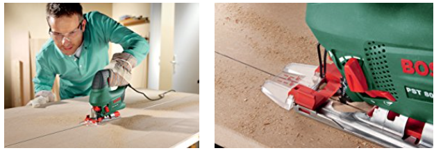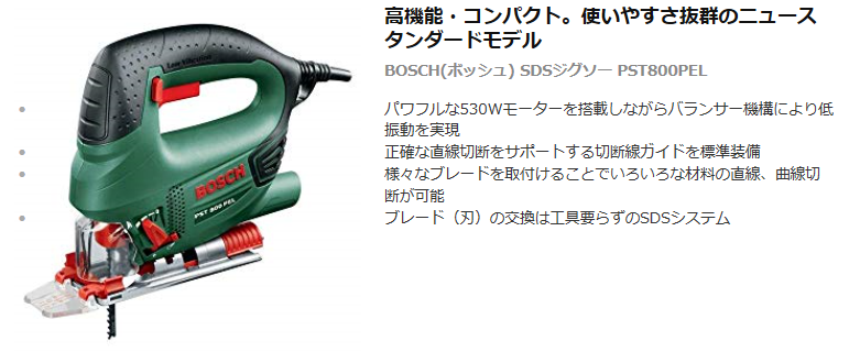 2019/05/01 Category : ジグソー の ベストセラー 使いやすさ抜群のニュースタンダードモデル。BOSCH(ボッシュ) SDSジグソー PST800PEL BOSCH(ボッシュ) SDSジグソー PST800PEL 様々な切り方が可能 曲線切り・・・オービタル機能を使わず、前進と戻しを繰り返しながら切断していきます。中抜き加工・・・ドリルで穴をあけて、刃を差し入れて切り進みます。対角にあけた穴でも同じ工程を繰り返し材の中を切り抜きます。切り欠く・・・両端に切り込みを入れてから斜めに切り進み、残った部分を最後に切り取ります。ポケット切断・・・フットプレートの先端を支点として、材に刃を徐々に押し下げ、切断していきます。中抜き加工のドリルによる穴あけを省略した加工です。斜め切り・・・フットプレートを角度調整することで刃先に傾斜をつけ、まっすぐに切断していきます。 ●パワフルな530Wモーター搭載ながら、バランサー機構により低振動を実現。薄い材料から繊細な切断まで安定した切断作業が可能。●軽量・コンパクトに加えて、より正確な直線切断をサポートする切断線ガイドを標準装備するなど、従来機より使いやすさがさらに向上。●ブレード(刃)の動きにしゃくり運動を加えるオービタル機能は4段階、けがき線をクリアに保つブロア機能 BOSCH(ボッシュ) SDSジグソー PST800PEL