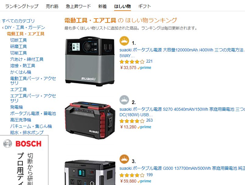 2019/06/30 Category : 電動工具・エア工具 の ほしい物ランキング 電動工具・エア工具 の ほしい物ランキング 電動工具・エア工具 の ほしい物ランキング最も多くほしい物リストに追加された商品。⇒電動工具・エア工具 の ほしい物ランキング 電動工具・エア工具 の ほしい物ランキング最も多くほしい物リストランキング!1. suaoki ポータブル電源 大容量120000mAh /400Wh 三つの充電方法 AC & DC & USBなど5WAY出力 正弦波 家庭用蓄電池 LCD大画面表示 車中泊 キャンプ 防災グッズ 停電時に 2. suaoki ポータブル電源 S270 40540mAh/150Wh 家庭用蓄電池 三つの充電方法 AC(150W) DC(180W) USB出力 急速充電QC3.0 車中泊 キャンプ 釣り アウトドア 防災グッズ 地震 停電時に 二年間保証 3. suaoki ポータブル電源 G500 137700mAh/500Wh 家庭用蓄電池 純正弦波 液晶大画面表示 三つの充電方法 ソーラー充電 ACコンセント(300W 瞬間最大600W)DC/USB/Type-Cなど出力 急速充電QC3.0搭載 車中泊 キャンプ 防災グッズ 停電時に 二年間保証 電動工具・エア工具のほしい物ランキングについて これらのリストには、ほしい物リストとレジストリに最も多く追加された商品を掲載しています。⇒電動工具・エア工具 の ほしい物ランキングAmazon内で紹介しているさまざまなランキングをわかりやすくご案内します。